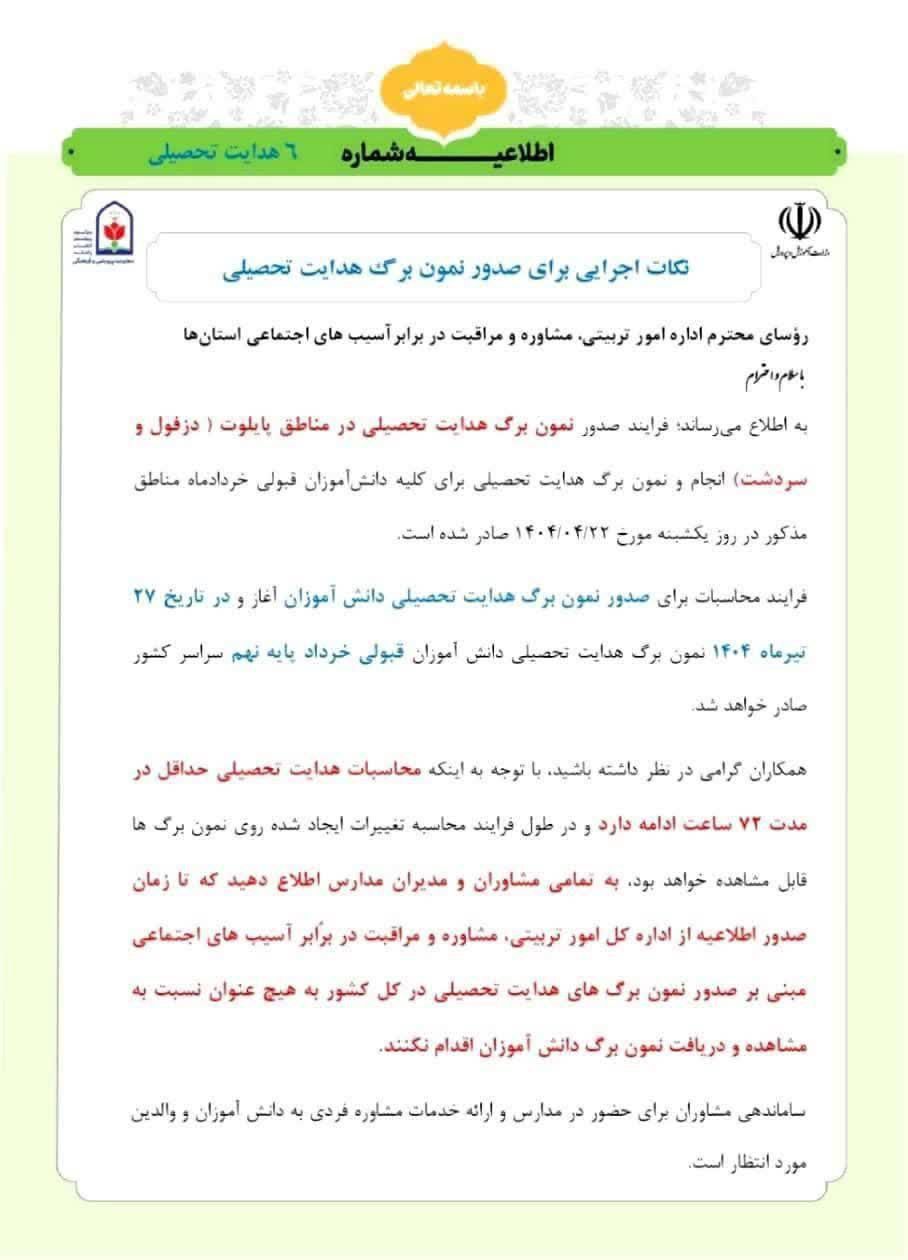 باتوجه به اینکه محاسبات هدایت تحصیلی حداقل تا ۷۲ ساعت ادامه دارد و در طول محاسبات تغییرات در نمون برگ هدایت تحصیلی قابل مشاهده است به اطلاع کلیه مدیران و مشاوران متوسطه اول می رسانیم که تا زمان صدور اطلاعیه رسمی از اداره کل امورتربیتی، مشاوره و مراقبت در برابر آسیب های اجتماعی وزارت مبنی بر صدرو نمون برگ هدایت تحصیلی، به هیچ عنوان نسبت به پرینت و دریافت نمون برگ اقدام ننمایند..⚠️
