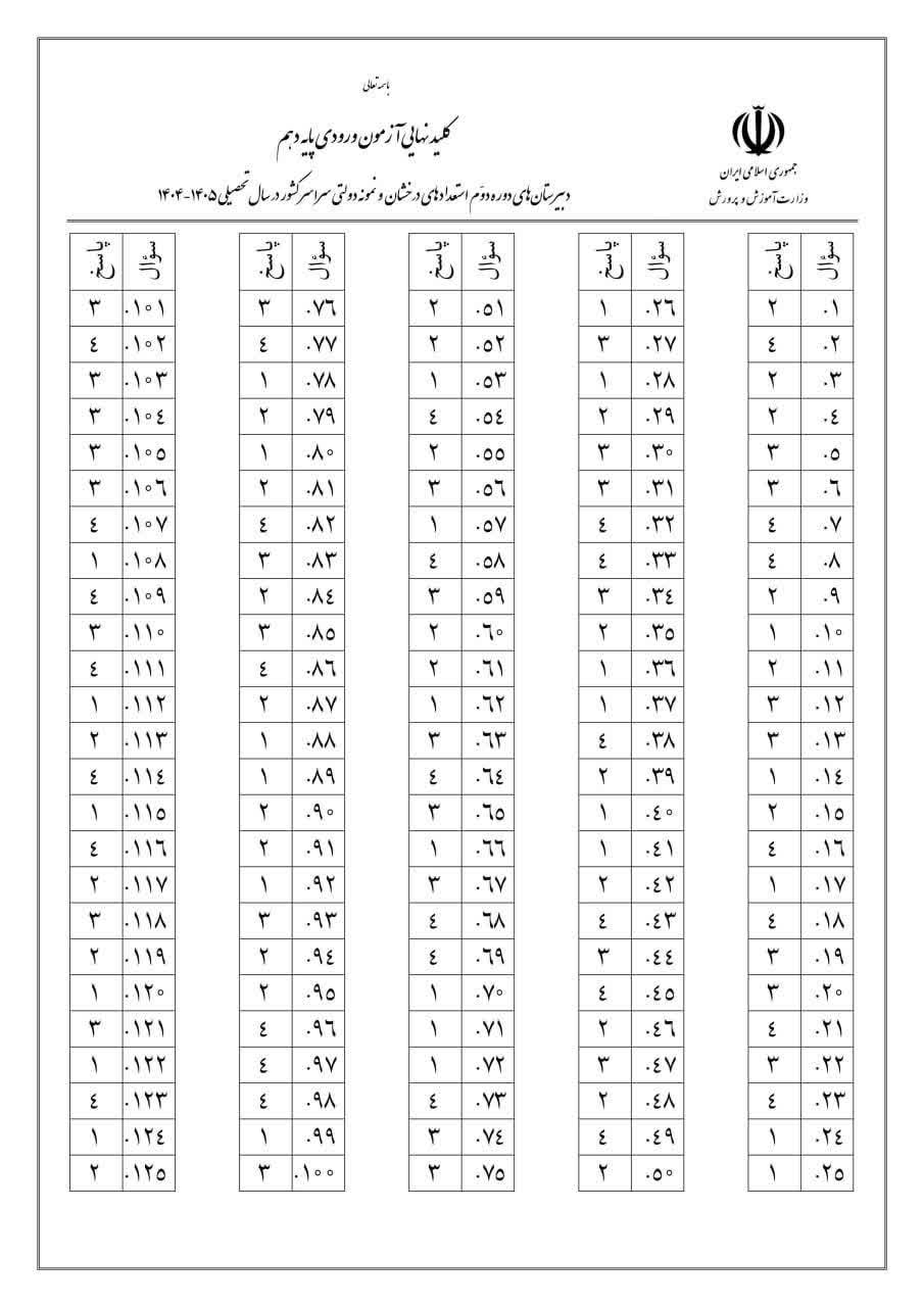✅ کلید نهایی آزمون تیزهوشان ۱۴۰۴